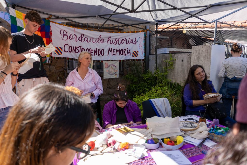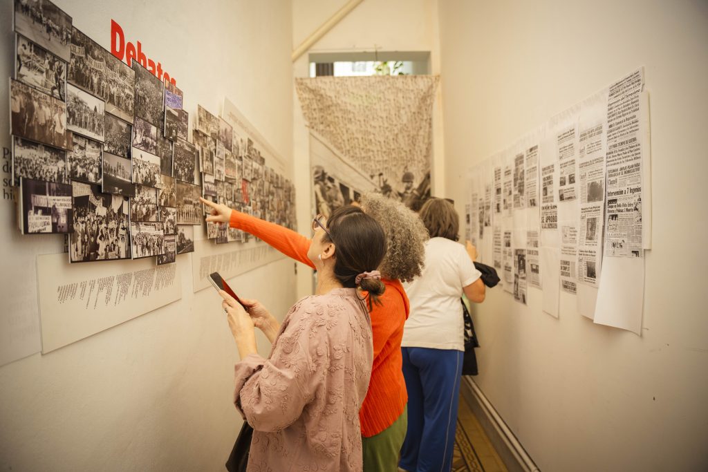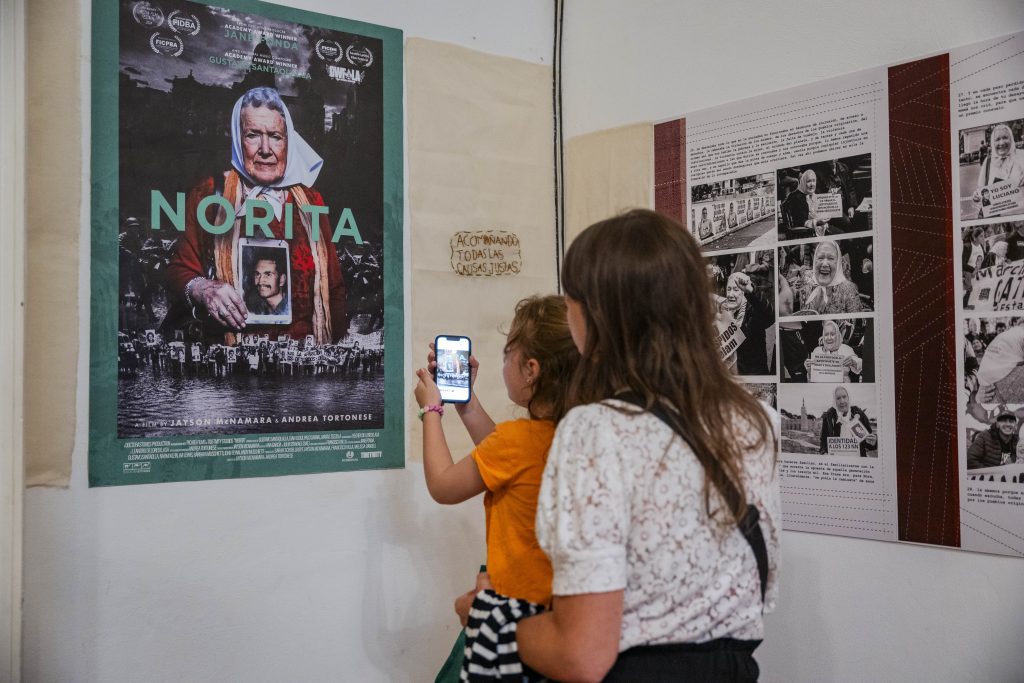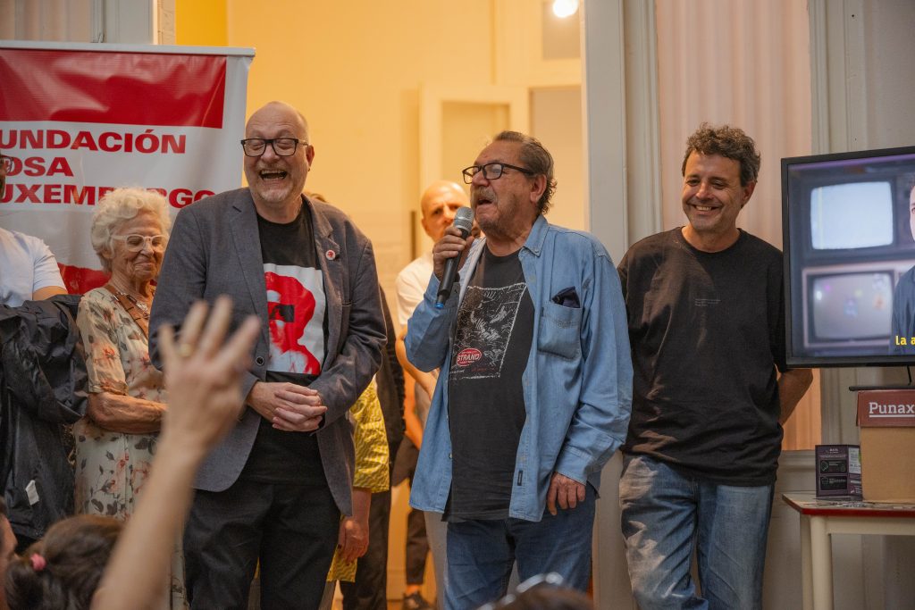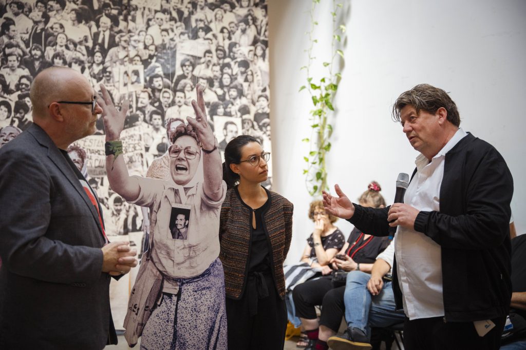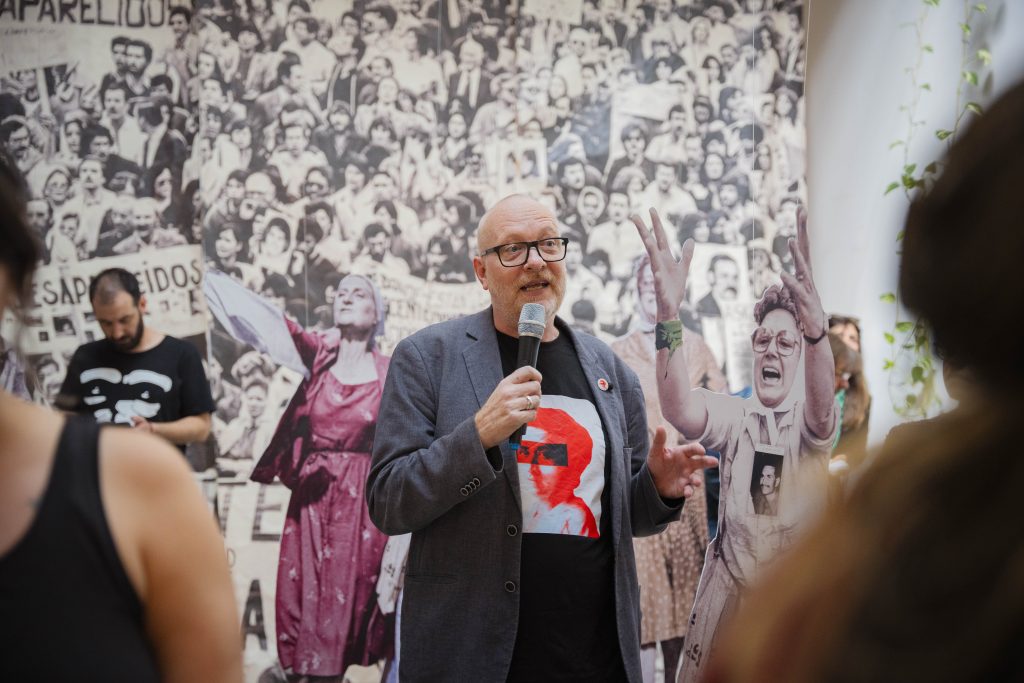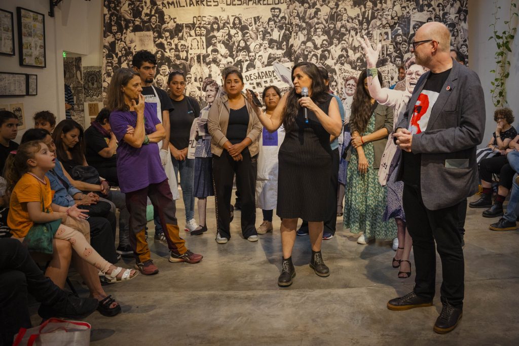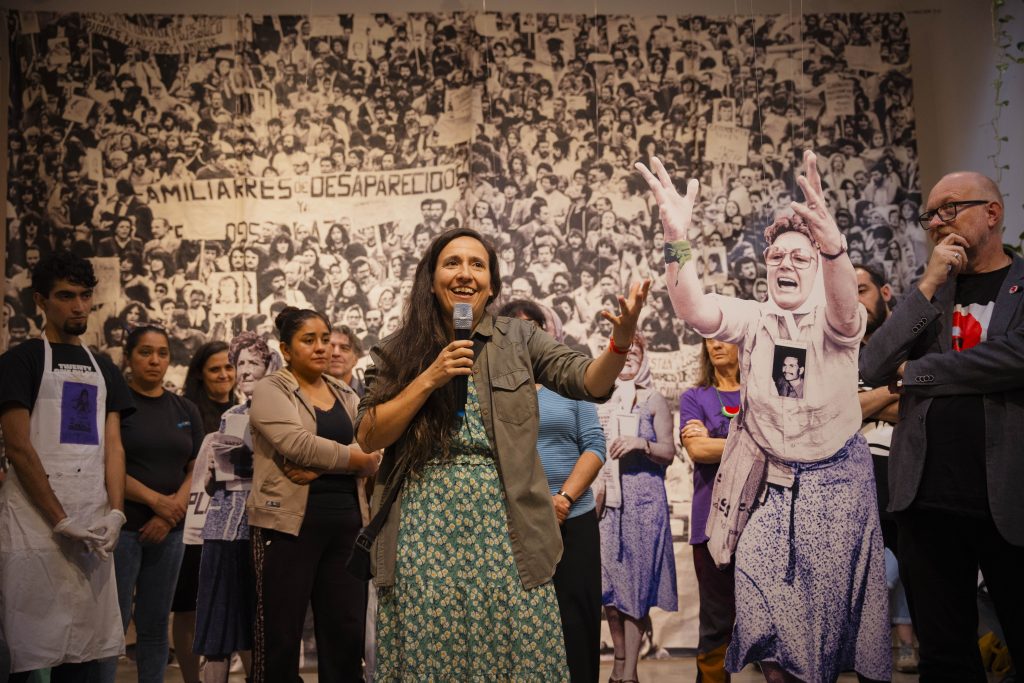 A 50 años del golpe, inauguramos en nuestra sede la muestra “MÁS QUE NUNCA: ¡DEMOCRACIA!”. La instalación reunió archivos de Nora Cortiñas por Monada Nómadas y Norita Film, bordado colectivo de la Cooperativa Gráfica La Voz de la Mujer de FOB A y un adelanto documental del Mapa de la Policía. Participaron de la apertura Torge Löding, Golschan Khun-Jush (Embajada Alemana) y Wolfgang Kaleck (ECCHR).